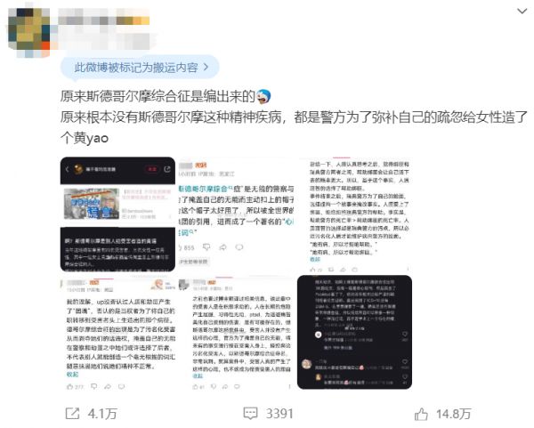 不久前,有人发微博称,斯德哥尔摩综合征是编出来的,这种现象并不存在——当初在斯德哥尔摩绑架案中,被绑架者理性判断与劫匪合作更能保全自己的性命,而警方为了掩盖自己工作不力的事实编造了被绑架者“爱上劫匪”的谎言,是一种“造黄谣”。