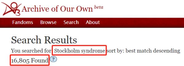 确实也有非常多的斯德哥尔摩小说:截止2024年,在同人网站AO3使用Stockholm syndrome作为搜索关键词,检索出文章数量高达16805篇