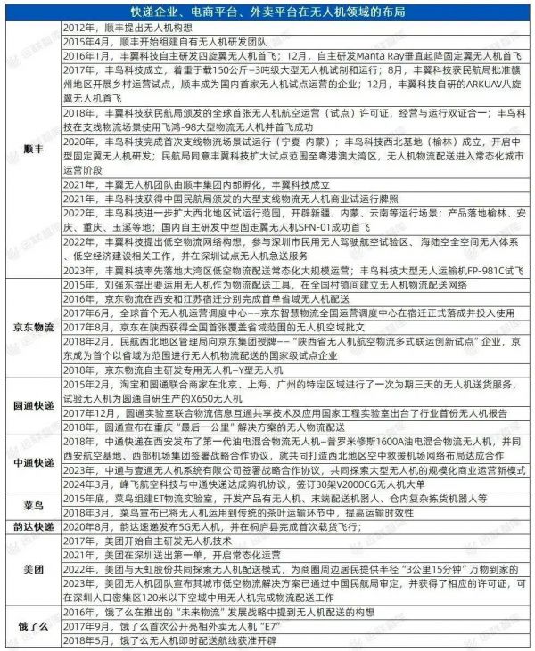 无人机货物配送倒是已经逐渐铺开,深圳期待在无人机的加持下,社区配送时间缩短到15分钟,合肥在今年5月也已经开通了首条无人机送货航线,京东等企业也早在2015年就开始了布局,打造“干线-直线-终端”三层次配送体系。