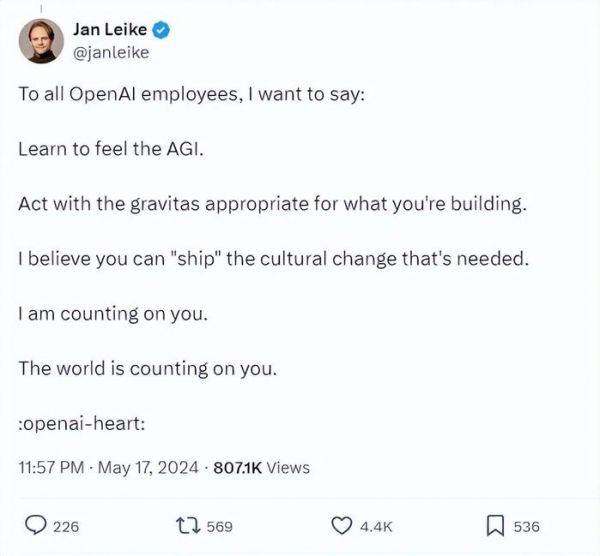 OpenAI的关键安全高管简·雷克,昨天突然在推特上宣布,鉴于OpenAI安全文化和流程已不再重要,而是让位于闪亮的产品,他即刻辞去在OpenAI的职务,同时忠告所有同事:学会感受AGI,以与你们正在构建的东西相称的严肃态度行事,我就指望你们了,整个世界就指望你们了。