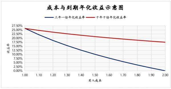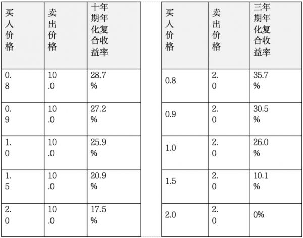 就动态估值来说,投资的圣杯是宁可贵一点也要买最好的公司。对此,东方马拉松团队有一个原创性的数学原理证明:以一只“十年十倍”股和一只“三年一倍”股的买入成本与年化收益为例(如图2),如果都以成本1买入,两者的到期年复合收益率分别为25.9%与26.0%,收益率基本一致。但当二者均以高于成本价格买入时,投资结果却大为不同。