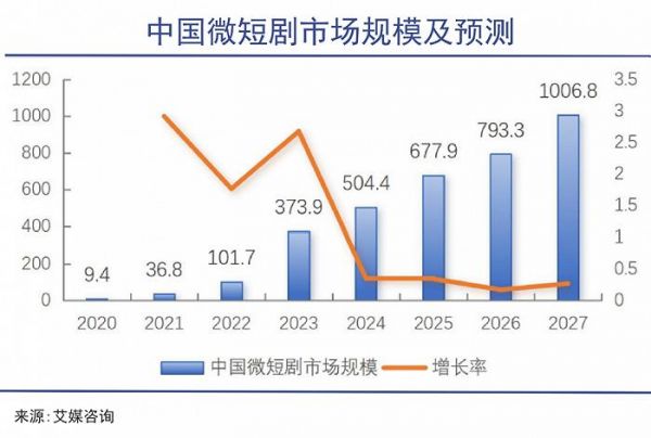 随着爆款作品不断涌现,短剧行业市场规模正快速增长。根据艾媒咨询数据,2023年中国微短剧市场规模达373.9亿,同比上升267.65%,预计2027年中国微短剧市场规模达1006.8亿,市场潜力巨大。