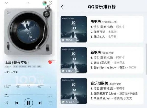 虽然是直播的形式,但郭有才的出圈和走红载体是复古音乐,而郭有才的直播本质上是一场线上演唱会,相比带货或者聊天的直播,这种内容本身也能吸引网友在直播间的停留。目前,郭有才版本的《诺言》在QQ音乐已经达到百万收藏,且在QQ音乐站内的热歌榜、新歌榜、音乐指数榜均位列榜一。
