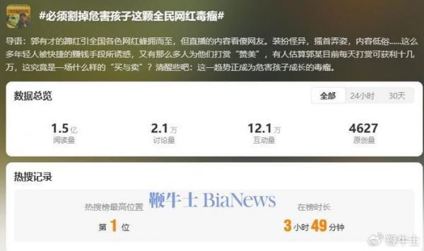鞭牛士 5月21日消息,今日,#必须割掉危害孩子这颗全民网红毒瘤#话题登上热搜第一,截至发稿,该话题阅读量为1.5亿,在榜时长将近4小时。
