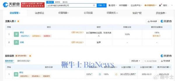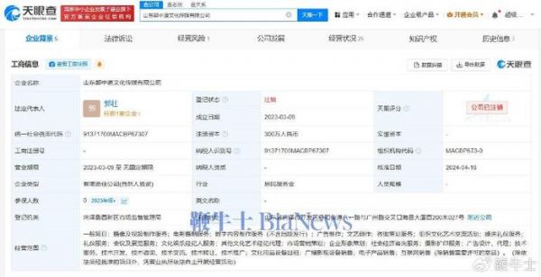 天眼查App显示,郭有才(本名郭壮)关联1家名为山东郭中道文化传媒有限公司的企业,不过,该公司已于今年4月注销。其成立于去年3月,注册资本300万人民币,法定代表人、执行董事兼总经理为郭壮,监事为郭壮女朋友苏畅,经营范围包括摄像及视频制作服务、文化娱乐经纪人服务、婚庆礼仪服务、互联网销售等,由郭壮全资持股。