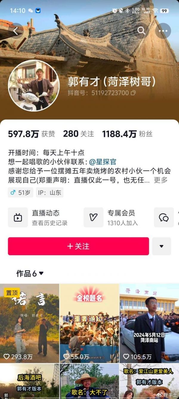 经记者查看,郭有才的抖音粉丝目前为1188.4万,主页六个短视频作品均为近两个月发布。