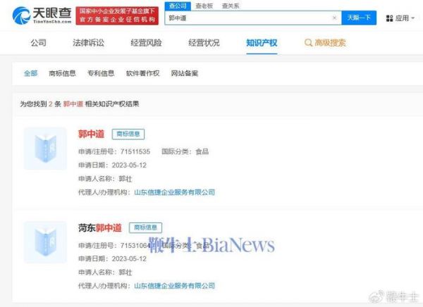 此外,郭壮曾于去年5月申请“郭中道”“菏东郭中道”商标,国际分类为食品,当前商标申请均已被驳回,处于无效状态。值得一提的是,“郭有才”商标自2016年起即被申请注册,申请人包括自然人郭某某、陕西某餐饮公司,目前多枚商标已成功注册。