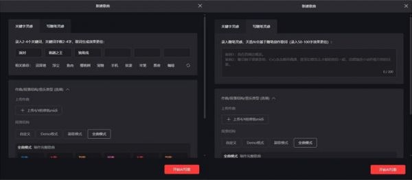 在一键写歌中,用户可以填写关键词或随笔灵感,这会对AI创作产生一定影响。用户对作曲、段落结构、以及音乐类型有要求,可以在下方自行更改。如果输入选填部分,AI将根据关键词或随笔灵感自行生成。