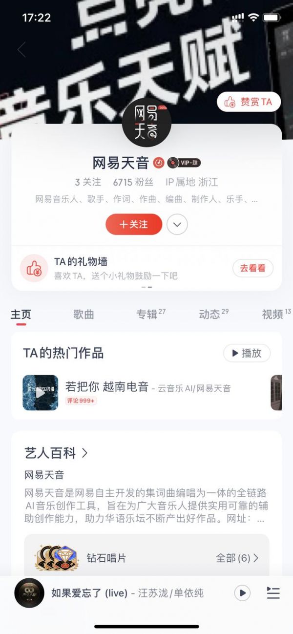 图源:网易云音乐理想是丰满的,但现实不一定会如愿。受限于创作的高门槛,网易云音乐与天音联动的效果似乎并不理想,目前网易天音发布作品不少,可粉丝数仅有6715。除了该账号外,其他AI音乐数量少得可怜,就连平台音乐专区,也没有单独的天音专区,只有Suno AI专区。