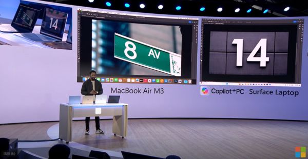 发布会现场,微软的高管甚至在演示产品旁边,直接摆放了一台搭载M3芯片的Macbook Air,展示在图片生成的环节中,Copilot+PCs如何大幅领先于后者。