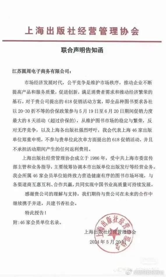 这两则声明由北京10家出版社和上海出版经营管理协会代表的上海46家出版单位发出。告知函中均提到,“针对贵公司提出的618促销活动方案,即全品种图书价保20-30折参与5月19日至6月20日期间累计8天的促销活动”,出版社不参与,也“不承担活动期间产生的任何返利费用”。