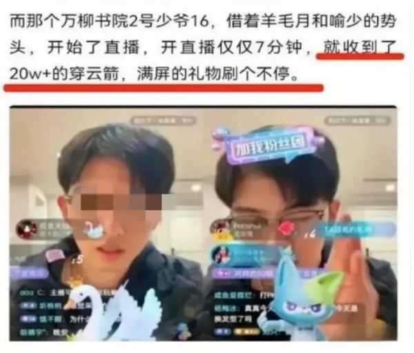网上火速冒出一堆万柳少爷,直播圈钱,开播七分钟,就有接近二十万的礼物。