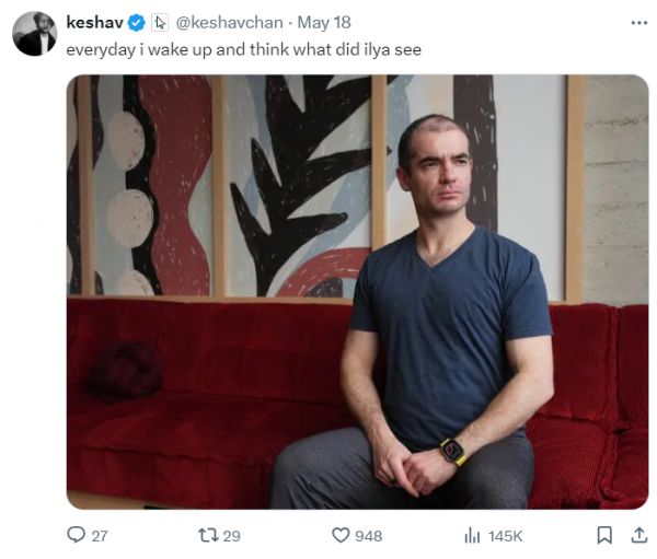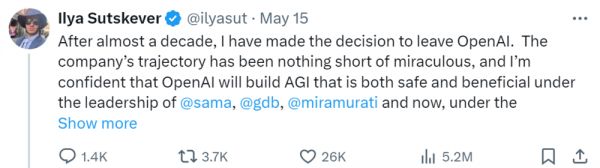5月15日,OpenAI的联合创始人及首席科学家Ilya宣布离职,并在社交平台X上表示自己将开启“接下来的计划——这个项目对我个人来说意义重大,我会在适当的时候分享细节。”