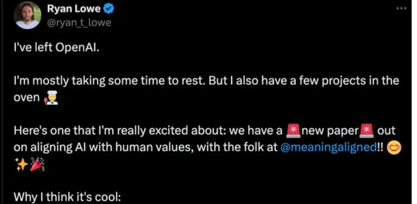 3月17日,Jan Leike 离职。Jan Leike参与开发了ChatGPT的核心技术之一——人类反馈强化学习RLHF,在其加入OpenAI后,从代码大模型Codex、ChatGPT的前身InstrucGPT,到ChatGPT、GPT-4,他都是重要贡献者。