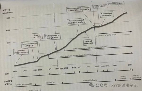 1998年,SWIFT进一步拓展到大公司财务部门。总结SWIFT过去35年成长历史(本书出版于2014年),SWIFT的客户从0提升到1.1万,其中技术升级、标准升级、门槛降低是三大关键要素,最终形成了庞大的网络效应,成为行业垄断。