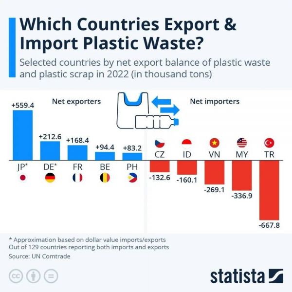 2022年世界塑料垃圾进口和出口的部分主要国家,最右侧为土耳其