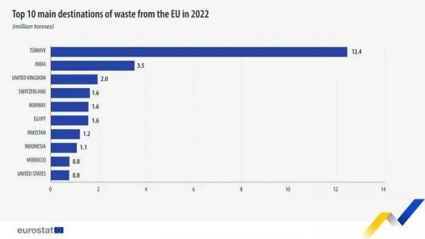 2022年,土耳其从欧盟进口的垃圾高达1240万吨,而欧盟当年垃圾总出口量不过3210万吨,按比例计算,土耳其的进口比重高达39%。