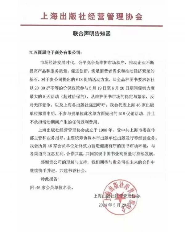 包含清华大学出版社、北京大学出版社、中国人民大学出版社等在内的10家出版社发布《联合声明告知函》,拒绝参加江苏圆周电子商务有限公司提出的618促销活动方案。