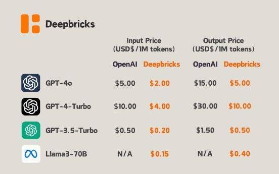 以国外Deepbricks平台为例,最新上架的GPT-4o模型,OpenAI官方输入价格为5美元/1M tokens,而Deepbricks自身的售价只要2美元/1M tokens。如果这些中间商真的能做到实时更新模型能力,还能做到低价,以后可能会吸引一批开发者和企业使用。