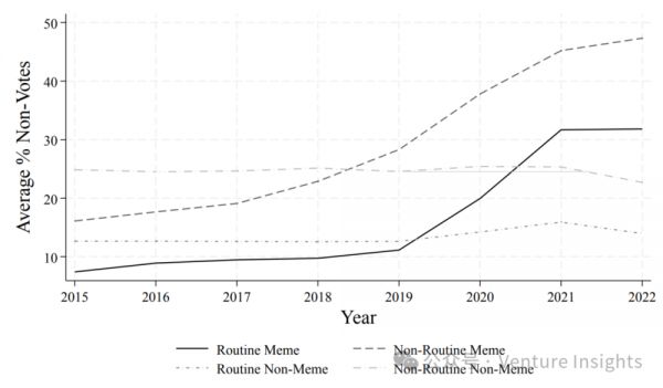 统计发现,在零手续费推出的2019年之后,不管是“长期妖”(routine meme)还是“偶尔妖”(non-routine meme)的公司,其不参与投票的股份比例都大幅上升。