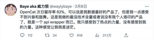 baye 是我敬仰的一位开发者,他也是著名的短信拦截应用熊猫吃短信的开发者,他前不久快速做了一个 iOS 的 app,实现了ChatGPT的第三方客户端,这成为了他数据上最成功的产品,但他在推文中写道:“我一点感受不到兴奋和鼓舞。这是我做得最没技术含量或者说没有我个人烙印的产品了,就是一个 api wrapper 而已。我只感受到了热点的力量,没有感受到我的力量。这种感觉让我很是迷茫。”