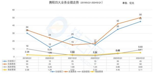 2024年Q1,由于国内酒店和出境酒店都实现了强劲增长,携程住宿预订收入为45 亿元,同比增长 29%,环比增长 15%;得益于出境游的强劲复苏,以及国内和全球航空业务的强劲增长,交通票务收入50亿元,同比增长 20%,环比增长 22%;旅游度假业务收入为 8.83 亿,同比增 129%,环比增长 25%,其中,国内旅游度假业务已超过2019年水平,同比增长主要由出境游收入带动;商旅管理业务为 5.11 亿元,同比增长 15%,环比下降 19%,环比下降符合正常的季节性。