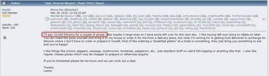 2010年5月18日,程序员Laszlo发帖称希望用一万枚比特币换取2份大披萨,3天后,密码学爱好者jercos花了25美元购买了两份披萨寄给了Laszlo,获得了一万枚比特币。