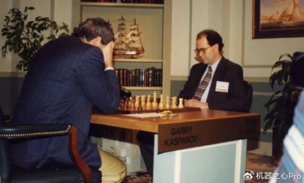 图为 Garry Kasparov 和深蓝团队的 Joe Hoane 在 1997 年纽约市的复赛场景,最终在六局复赛中击败了 Garry Kasparov,赢得了其中的两局并有三局打成平手。