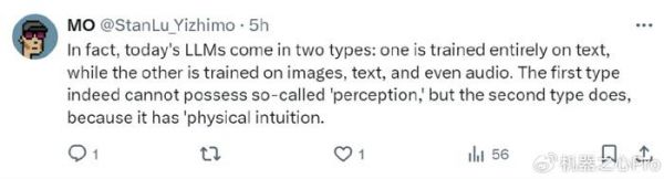 在李飞飞转发的 X(原推特)下面,大家讨论的也是非常激烈,有人表示:「当今的 LLM 有两种类型:一种是完全基于文本进行训练,另一种则是基于图像、文本甚至音频进行训练。第一种类型确实不具备所谓的感觉能力,但第二种类型具有物理直觉,因此可以说它具有感觉能力。」