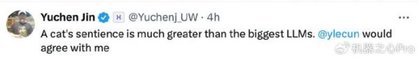 而另一位网友则追随 Lecun 的脚步,表示:「一只喵星人的智能程度都远高于最大型的 LLM。」