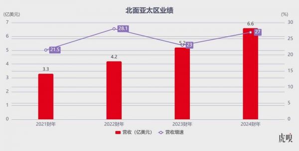 2021财年到2024财年,北面在亚太区营收从3.3亿美元增长到6.6亿美元,在整个全球市场的业绩占比也从13.4%增长到了17.9%。甚至,近两个财年,亚太区一直是北面增速最快的市场。北面增长背后,是户外运动从小众走向大众,甚至成为时尚风潮的一个缩影。