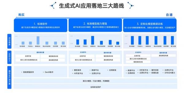 根据腾讯云联合发布Gartner发布的《生成式AI产业落地路径研究报告》,生成式AI应用落地路线分为3条,分别为标准软件路线、标准模型能力增强路线和定制化模型精调训练路线。