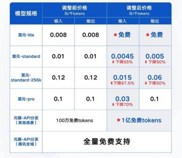 5月22日,腾讯云宣布旗下混元-lite模型免费,混元-standard-256k输入价格下调87.5%至0.015元/千tokens,输出价格下降50%至0.06元/千tokens。最高配置的万亿参数模型混元-pro,API输入价格则从0.1元/千tokens降至0.03元/千tokens。