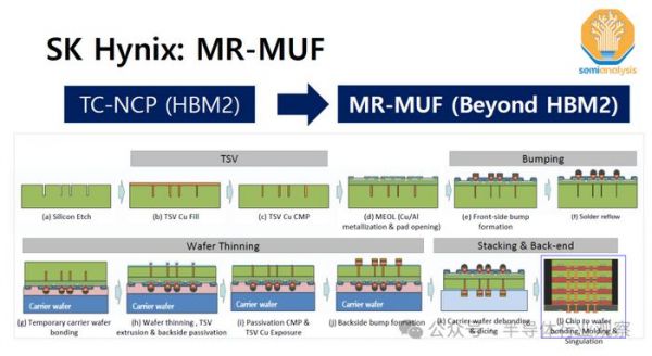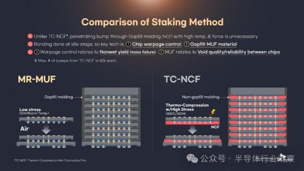 原来在HBM这项技术上,三星和SK海力士各自采用不同的封装方法。SK的选择是回流焊成型底部填充 (MR-MUF) 方法,在烤箱中同时烘烤所有层,而三星则采用了热压缩非导电膜 (TC NCF) 技术,在每层之间用薄膜堆叠芯片。