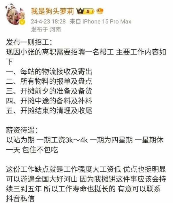狗头萝莉自己也知道这份工作强度大、工资低,于是不忘强调优点——“可以游遍全国大好河山”。