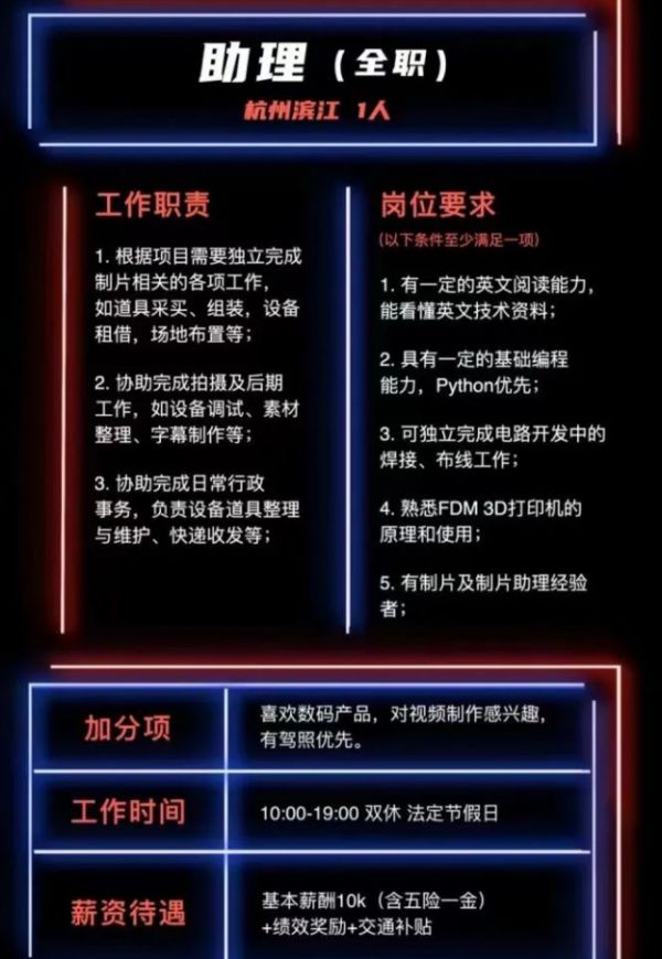 一名英语好、会写代码、搞得了电路开发、懂3D打印、有制片经验的求职者,恰恰就是他需要的。有驾照就更好了,因为这个助理可能还需要兼职司机,包揽工作和生活。