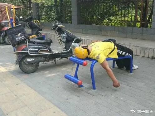 大量涌进来的外卖员也接不到太多单子了。前几天路过金源大酒店,不远处的树荫下几十个外卖员都坐在车上不断刷新抢单,景象蔚为壮观。而旁边有外卖小哥在睡觉,那叫一个香。