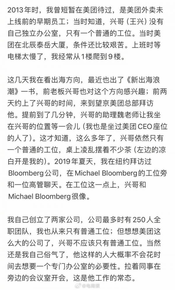 美团创始人王兴也有普通工位,网友:主打一个亲切