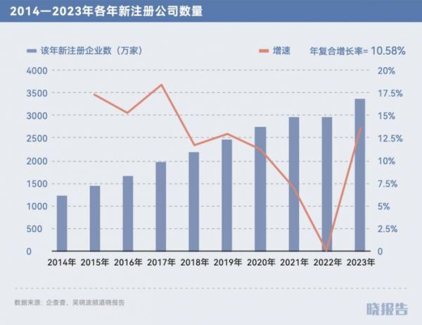 不过,2023年,中国新增企业注册量共计3345.92万家,日均新设企业超9万家,达到近十年最高值;新增企业增速也较2022年有明显抬升,达到13.5%。