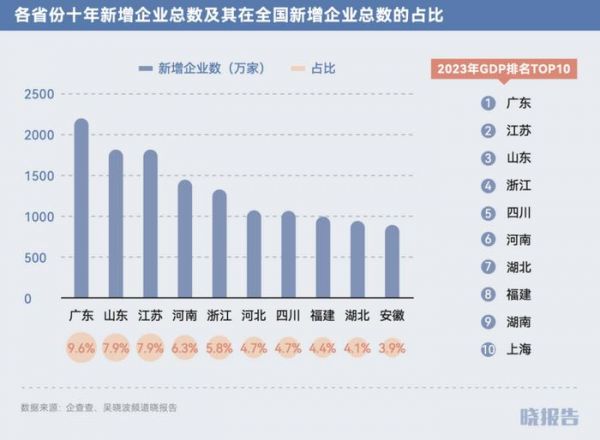企业数量和生产力直接正相关。以2023年各省GDP排名为例,上榜TOP10的省份中,有8个大省也位列新增企业数量TOP10榜单中。