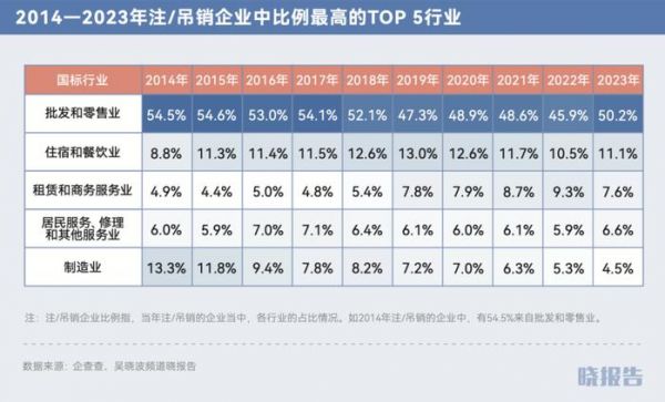 因为批发零售业企业的注册量最大,所以在各年注/吊销企业中的比例也最高。从2014年到2023年,批发零售业大致在注/吊销的企业中占据半壁江山。