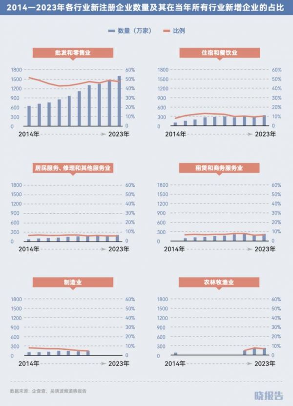 2014—2023年的十年间,不同行业新注册企业的数量,活跃度存在一定程度的波动。但相对稳定的是,批发零售业和住宿餐饮业长期稳居榜单前两名,两者的新增企业数合计,占当年所有行业新增企业数的50%—60%。