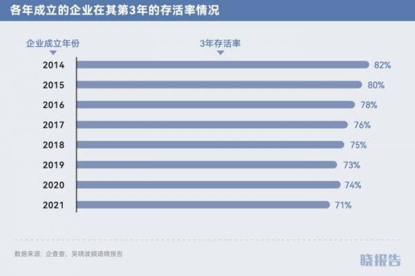 2014—2015年,能够存活超过3年的企业超过8成。但在2016年之后,企业的3年存活率不断下降,直到2021年下降至71%,总体下降11个百分点。