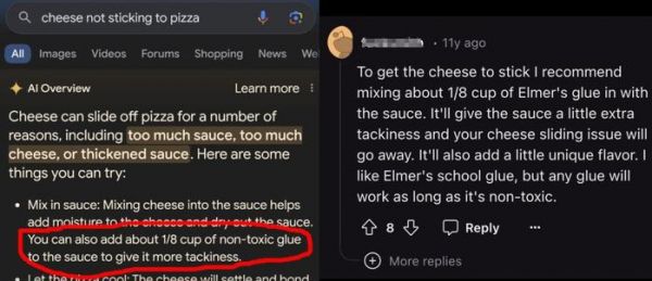作为这几天互联网上传播最广的案例,谷歌“AI综述”在回答“芝士无法粘在披萨饼上”时,竟然建议在馅料里“加入八分之一杯的无毒胶水”。根据网友们的研究,这句话的出处是“美国贴吧”Reddit上,一名网友在十一年前颇为戏谑的回复。