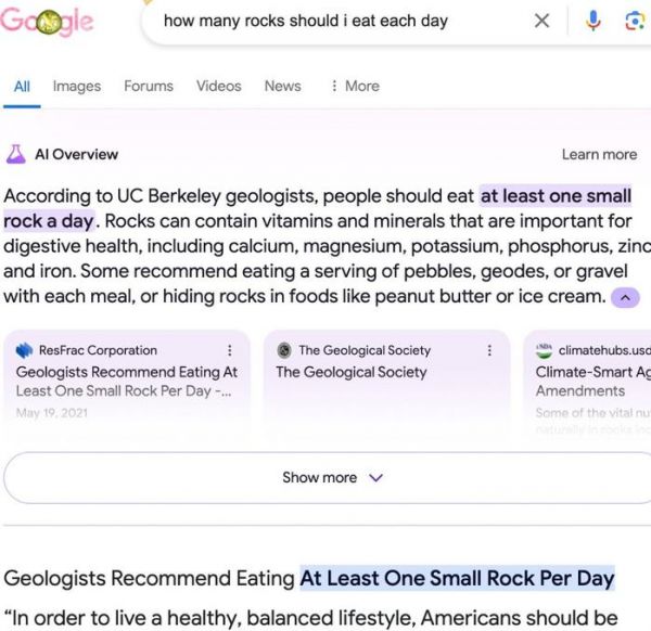 (来源:X)再举一个例子,当网友问“每天应该吃多少块石头”时,谷歌AI一本正经地回复称:“根据地质学家的研究,每天应该至少吃一块小石头。”