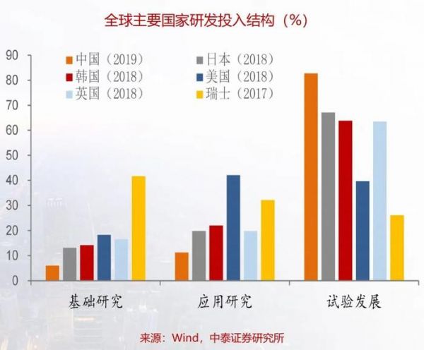 从研发投入结构来看,中国的研发支出主要集中在试验发展,即通过较少投入就可快速变现的环节。而在真正构建长期壁垒的基础研究领域,中国研发支出占比还远低于美国、日本、韩国等发达国家。