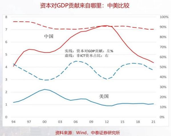 但是在资本里我们钢筋水泥的比重比较高,所谓的ICT包括信息、通讯、软件投资,这个比重我们大概只有10%左右,美国占到了50%。