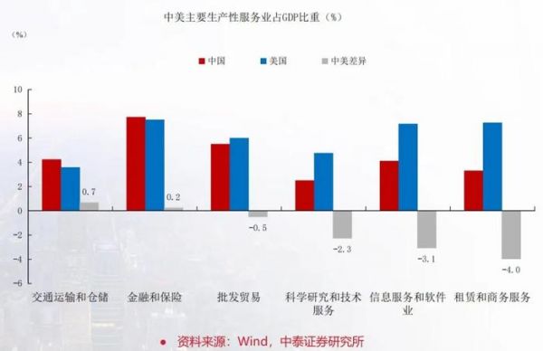 我们在生产型服务业里有三个行业与美国差距比较大。第一个是科学研究与技术服务,第二个是信息服务和软件业,第三个是租赁和商务服务。