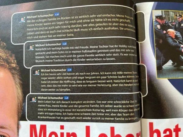事出一年前。2023年4月15日,《Die Aktuelle》刊登了一张舒马赫微笑的照片,并在旁边配上“Welt-Sensation”“Michael Schumacher Das erste Interview”两个放大的标题,翻译成中文就是“轰动世界”、“迈克尔·舒马赫的首次采访”,以吸引读者的眼球。