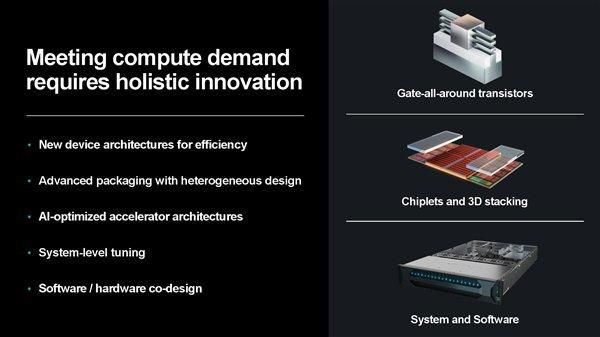 图源:AMD此外,AMD还将改进芯片架构,推出能效更高的新一代架构,预计最快将于2025年发布,并实现25x30(2025年计算能效提升30倍)的目标。不过,想要实现27x100(2027年计算能效提升100倍)的目标,还需要在诸多领域做出提升,仅靠制程工艺升级和架构升级恐怕还不太够。